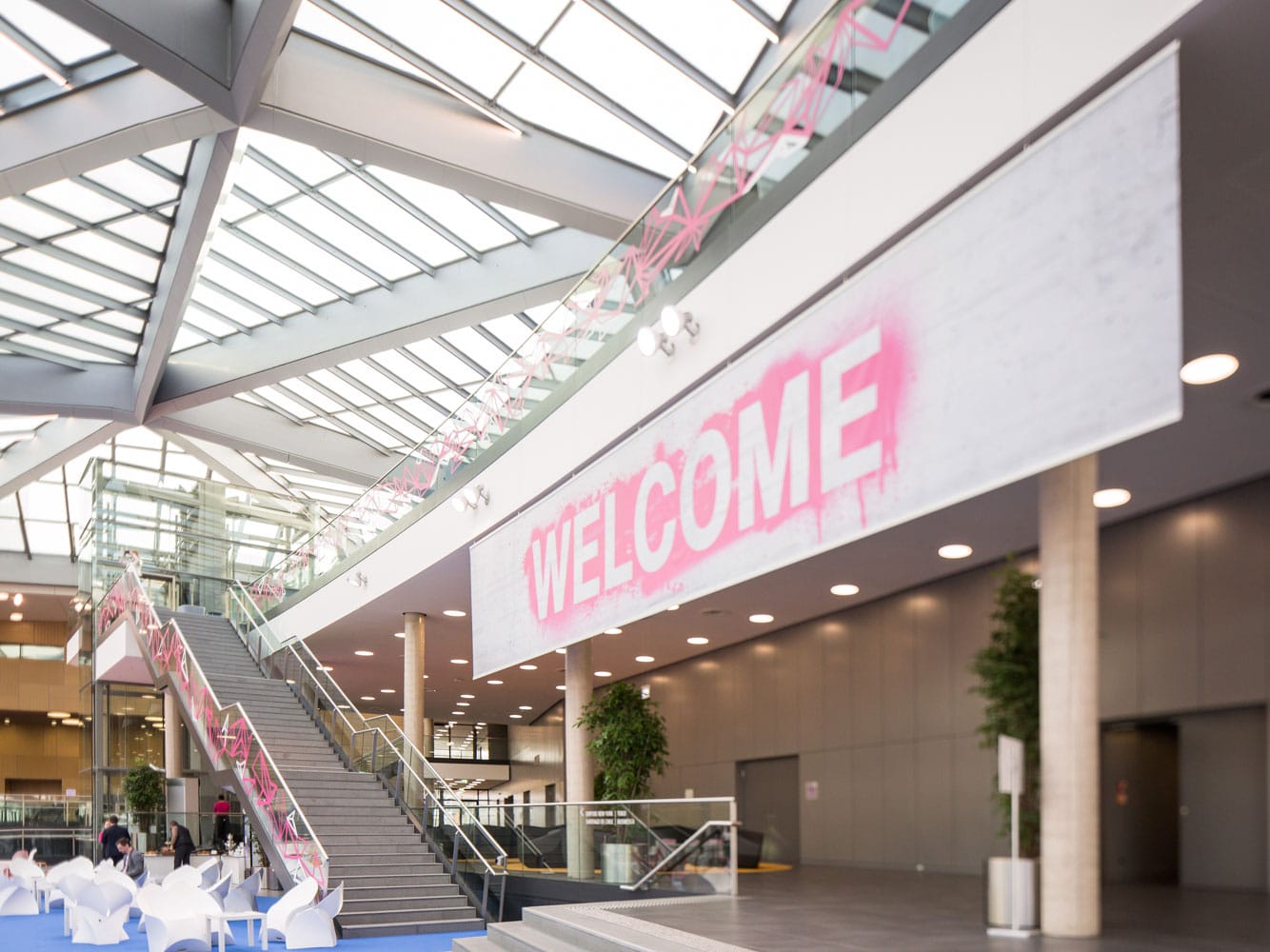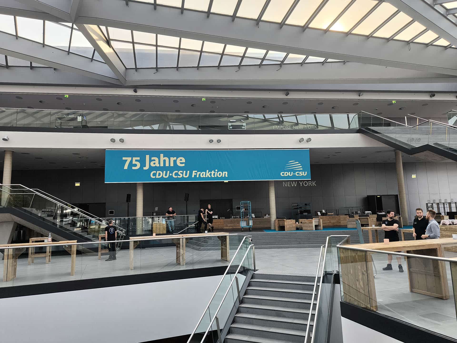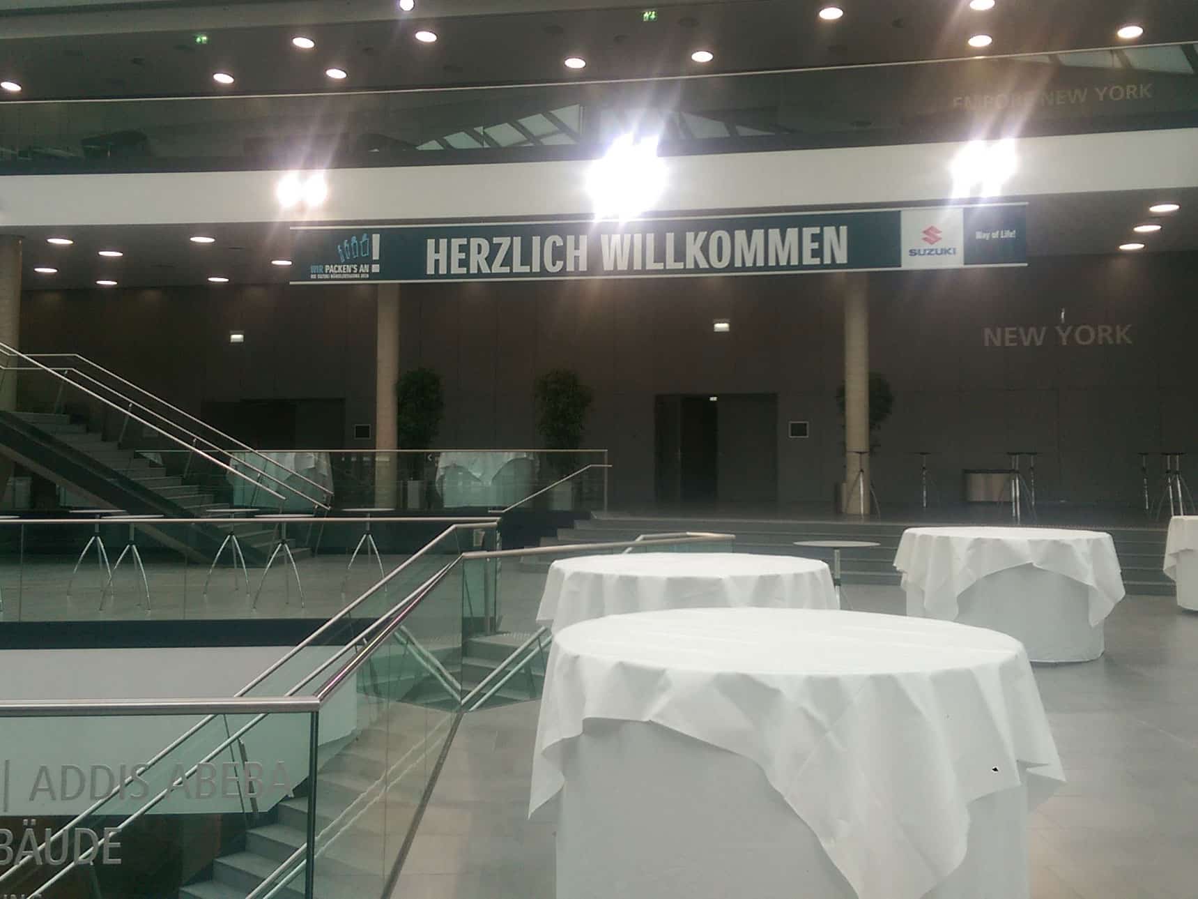 Das Herzlich willkommen Banner hat ein Maß von 13.000 x 1.000 mm