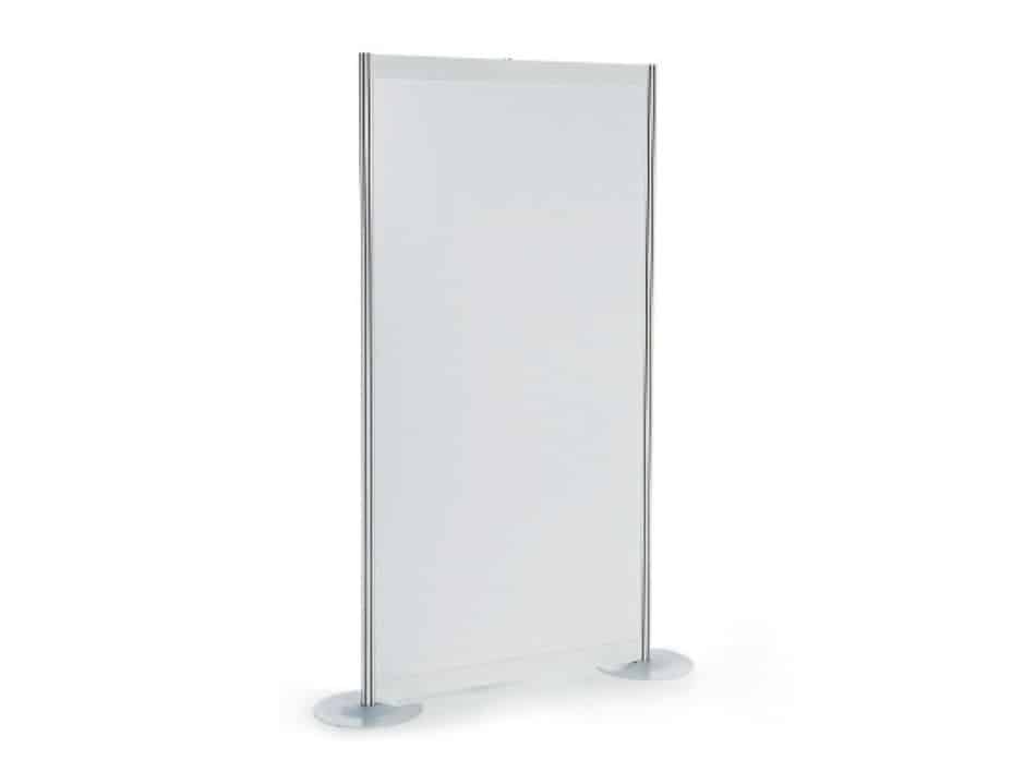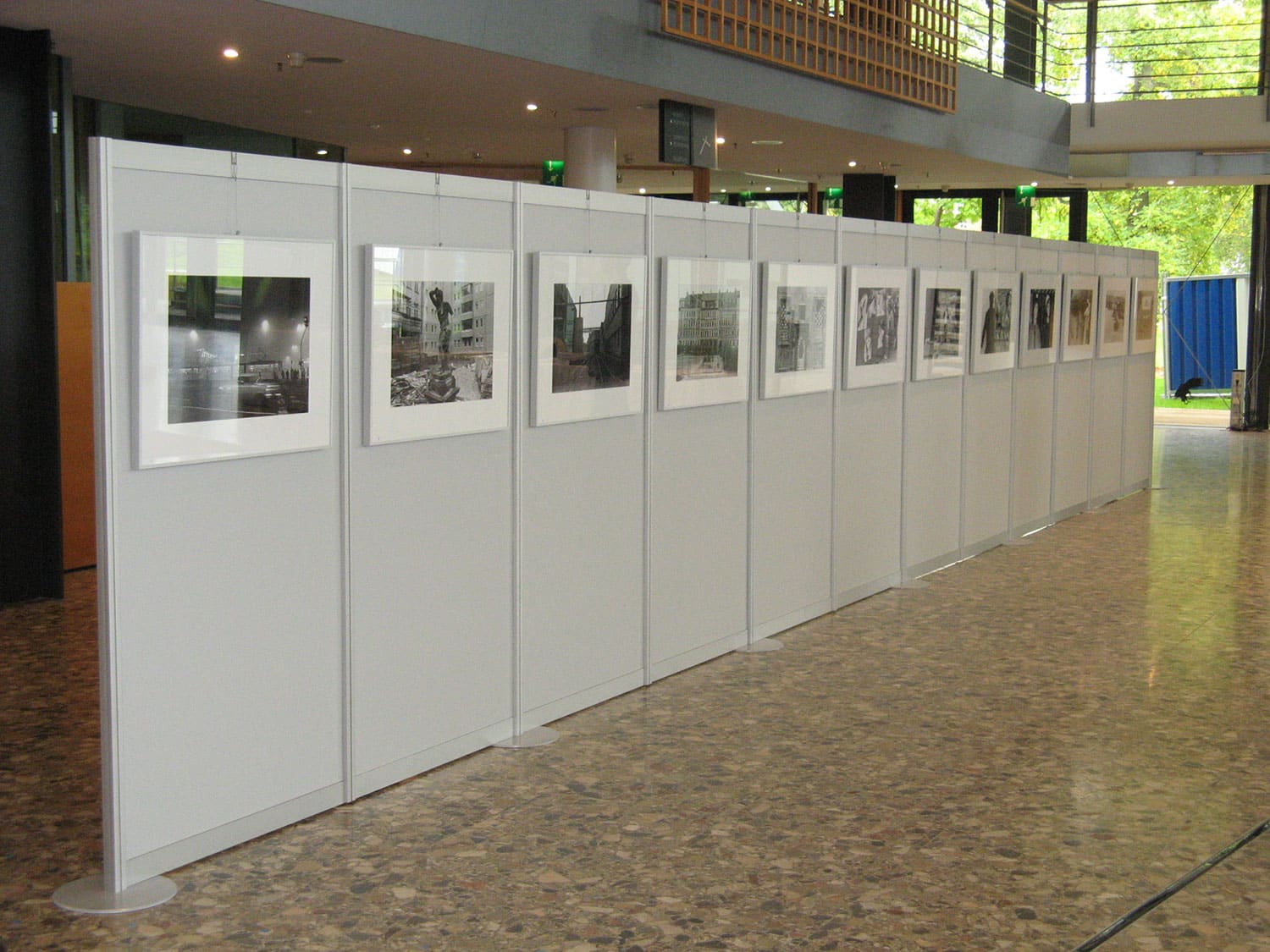Ohne Grafik ist die Stellwand weiß, Plakate lassen sich mittels wieder ablösbaren Posterstrips befestigen. Auch ein Abhängen von Bildern mittels in der Höhe einstellbarem Bilderhaken ist möglich.
